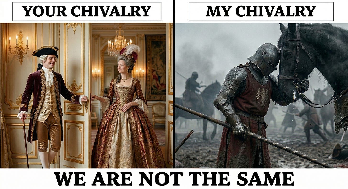 What chivalry IS is the depersonalized form of the French noun chevalier, which is to say a Cavalryman, which is to say a HORSEMAN. For those of you who are grammatical nerds, Grok tells me that the French -erie suffix involves shifting from the Subject of the Horseman, to the Object of Horsemanship. So chivalry IS in its essence, the set of qualities that made you excellent at the business of efficiently killing other men from the back of the horse.
